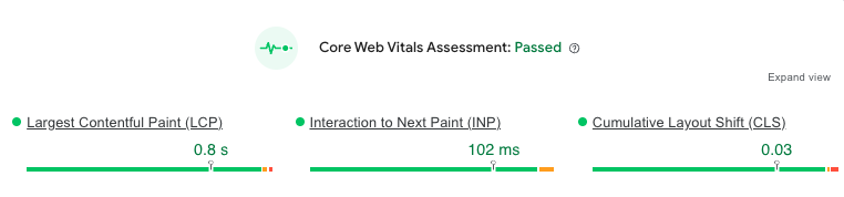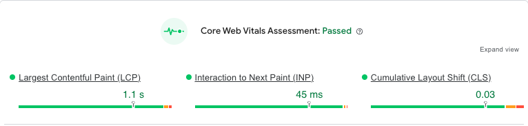 The results that we generated eliminated slow load times, and we transformed the site from an average performer to a website that passed all of Google’s Core Web Vitals with flying colours – as this mobile Core Web Vital screenshot quite literally shows.